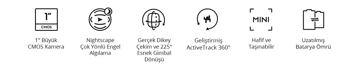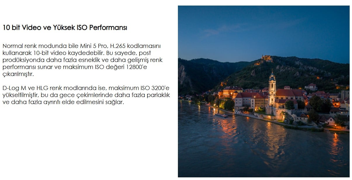 50 MP 1 inç CMOS sensör ve f/1,8 diyafram açıklığı ile Mini 5 Pro, zengin ayrıntılar ve net düşük ışık çekimleri yakalar. Kompakt boyutuyla profesyonel düzeyde görüntüleme sunar.
