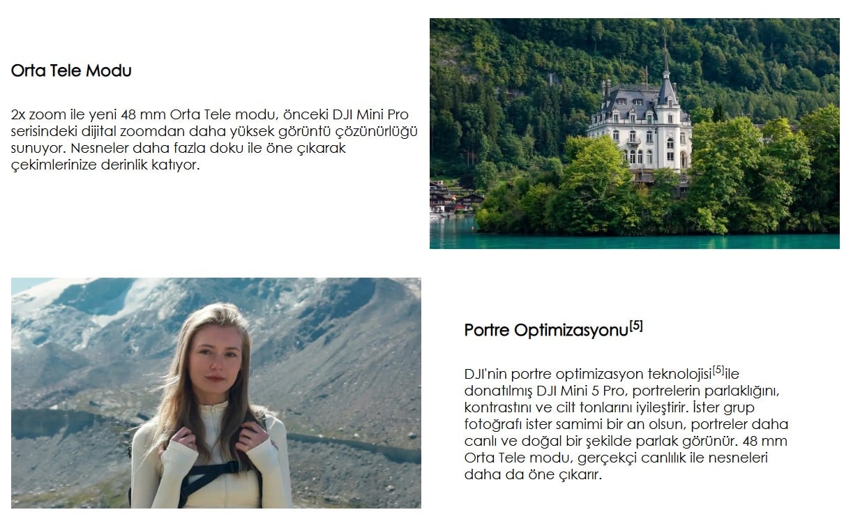 Mini 5 Pro, sinematik görseller için 14 durağa kadar dinamik aralık ile 4K/60 fps HDR video kaydını destekleyen 1 inç CMOS sensöre sahiptir[3]. Yeni görüntü işleme teknolojisi ve akıllı algoritmalarla geliştirilen bu büyük sensör[4], gün batımı ve gece manzaraları gibi düşük ışık koşullarında en küçük ayrıntıları bile korur ve zahmetsizce nefes kesici çekimler sunar. 48 mm Orta Tele modu ile nesneler daha belirgin bir şekilde öne çıkarken, portre optimizasyon algoritmaları[5] her görüntüyü olağanüstü netlikle yakalar.