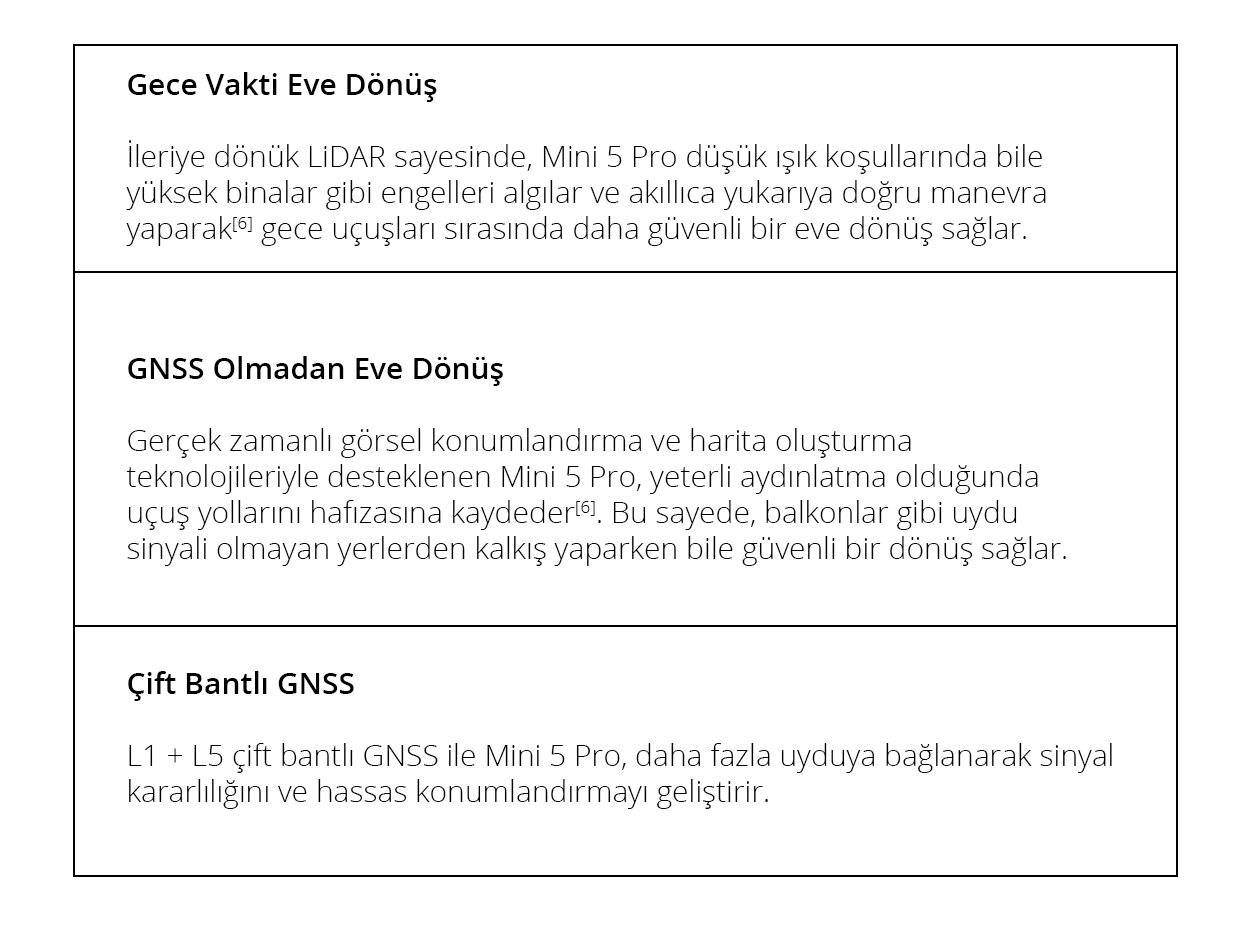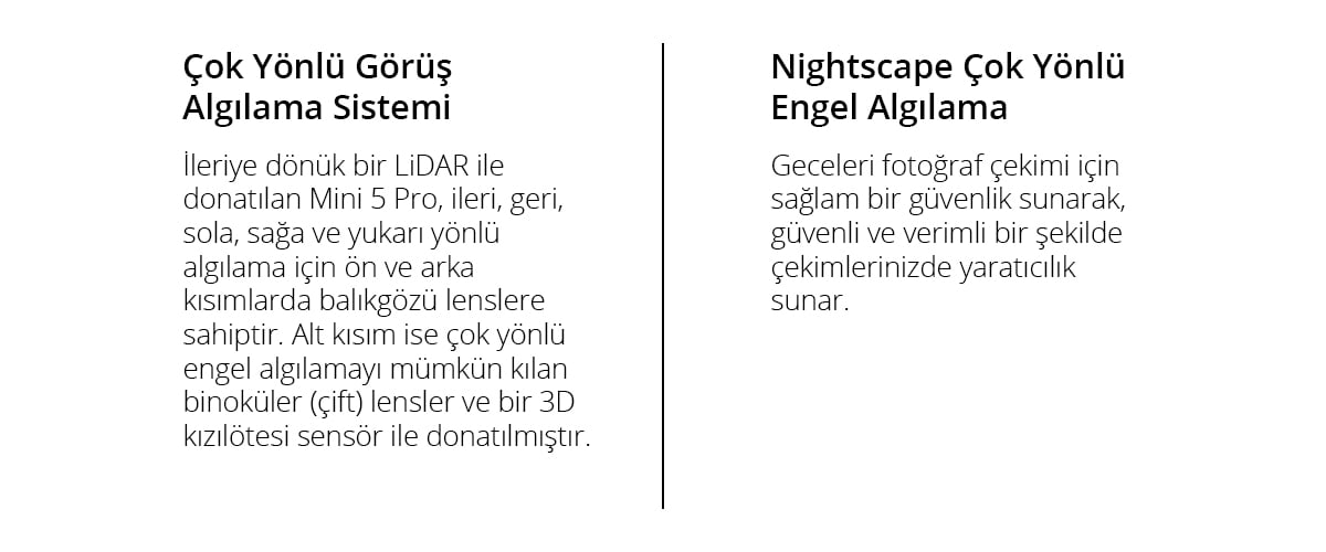 Mini 5 Pro, nightscape çok yönlü engel algılama[1] için ileriye dönük LiDAR ve çoklu görsel sensörlere sahiptir. Bu da eve dönüşü daha güvenli hale getirir.