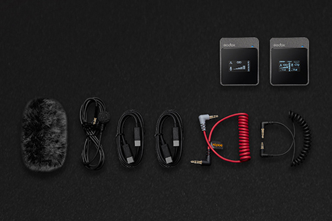 Kutu İçeriği: 1 x Verici 1 x Alıcı 1 x Rüzgar koruması 1 x 3.5mm TRS-TRS Kablo 1 x 3.5mm TRS-TRRS Kablo 2 x USB Type-C Kablo 1 x Yaka Mikrofonu |